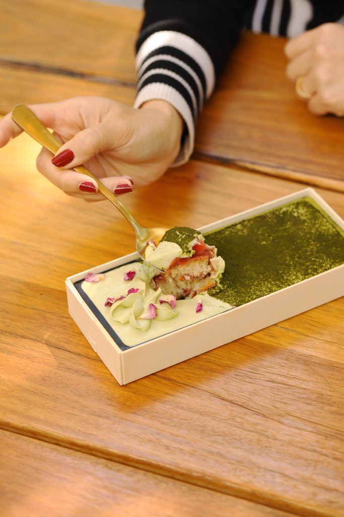 Matcha and vanilla cream cake, strawberry coulis and fresh strawberries with a dusting of matcha powder